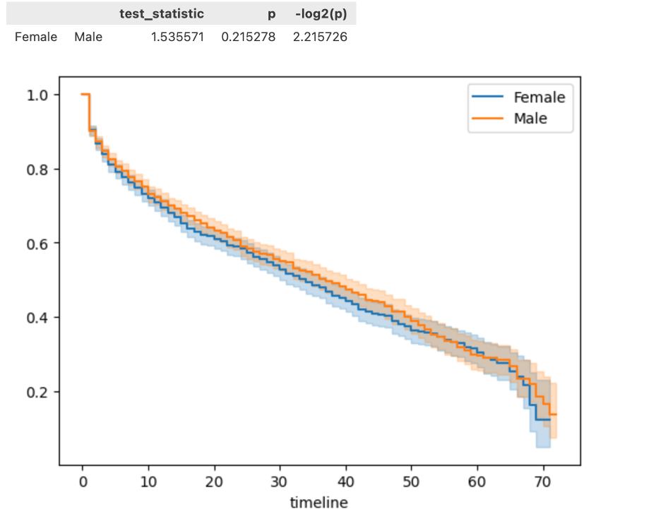 选取一个协变量,绘制多种协变量取值下的拟合曲线,进行假设检验,以确定该协变量的影响是否显著.下图选取的协变量是性别: