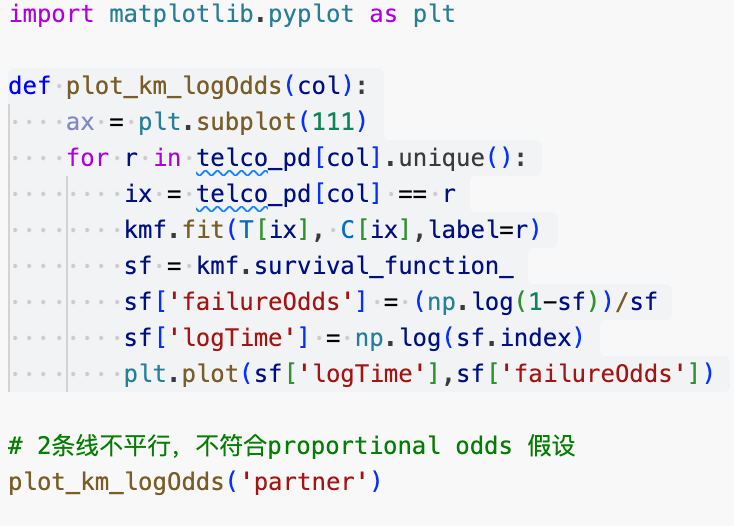 接下来检验proportional odds假设,发现两条线不平行,不满足假设,因此不能直接使用AFT模型: